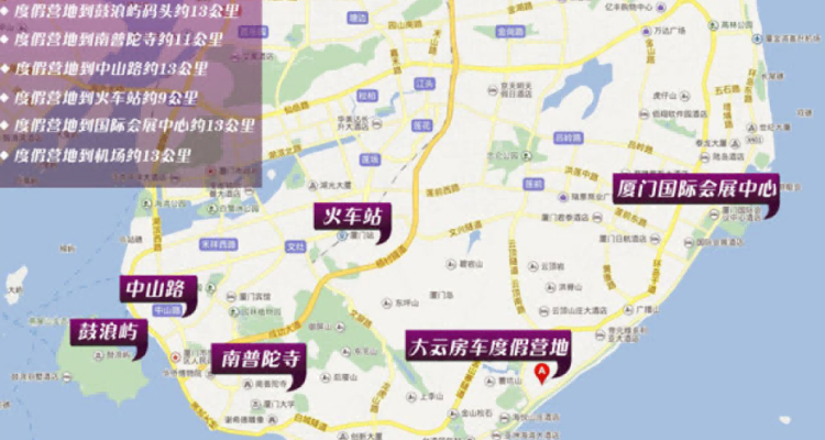 厦门大云房车露营地坐落于环岛路黄厝海滨沿畔,此处滨海沙滩是最干净、最自然的黄金海岸,可欣赏绝佳海景,此处紧邻城市中心,因为距离金门较近因此解放初期一直作为军事禁区所以得以保护。营地左邻国际会展中心,右与曾厝垵、胡里山炮台、南普陀寺、厦门大学等同街而立,坐拥海边胜景。